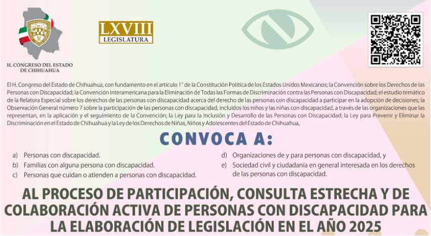 El Congreso del Estado, a través de la Comisión de Derechos Humanos y Atención a Grupos Vulnerables dará comienzo este lunes 09 de junio al Proceso de Participación, Consulta Estrecha y de Colaboración Activa de Personas con Discapacidad para la elaboración de la legislación en el año 2025.