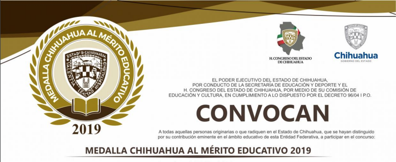 La LXVI Legislatura del Congreso del Estado de Chihuahua, convoca a todas aquellas personas originarias o que radiquen en la entidad, que se hayan distinguido por su contribución inminente en el ámbito pedagógico, a que participen en la Medalla Chihuahua al Mérito Educativo en su edición 2019, la cual tendrá un premio económico de 84 mil 800 pesos.