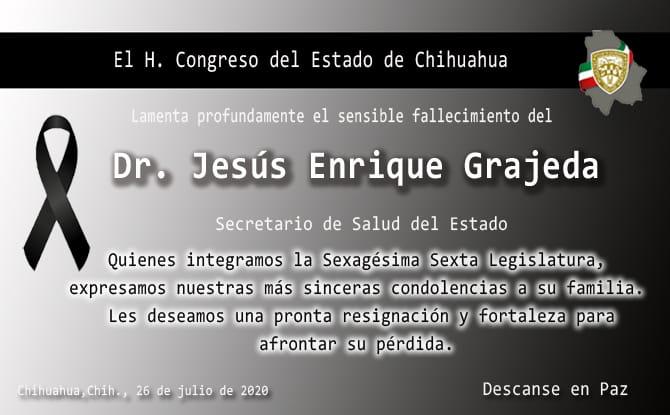 26 de julio de 2020. El H. Congreso del Estado de Chihuahua, lamenta profundamente el sensible fallecimiento del Dr. Jesús Enrique Grajeda, Secretario de Salud del Estado.