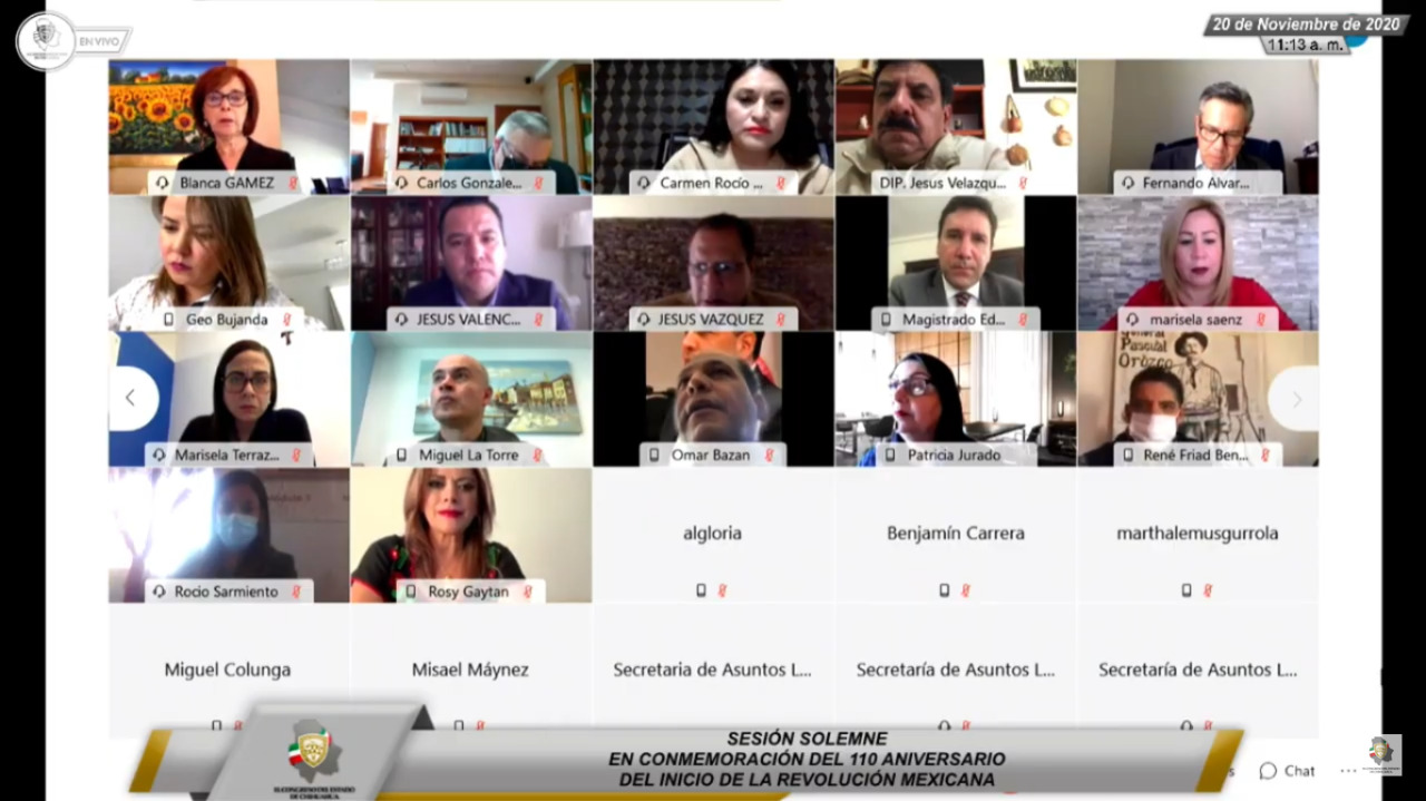Integrantes de la Sexagésima Sexta Legislatura del Congreso local, realizaron Sesión Solemne virtual o de acceso remoto, como parte de los festejos del 110 Aniversario del Inicio de la Revolución Mexicana, acto en el que estuvieron presentes el Dr. Carlos González Herrera, Secretario De Educación y Deporte, en representación del Gobernador Constitucional del Estado, Licenciado Javier Corral Jurado, y el Licenciado Edgar Aurelio Quintana Camacho, Licenciado de la Sala Civil Regional de Hidalgo del Parral, en representación del Magistrado Presidente del Tribunal Superior de Justicia Pablo Héctor González Villalobos.