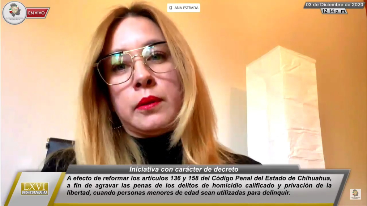 03 de diciembre de 2020. La diputada de MORENA, Ana Carmen Estrada García, presentó iniciativa de Decreto a efecto de reformar los artículos 136 y 158 del Código Penal del Estado, a fin de agravar las penas de los delitos de homicidio calificado y privación de la libertad, cuando personas menores de edad sean utilizadas para delinquir.
