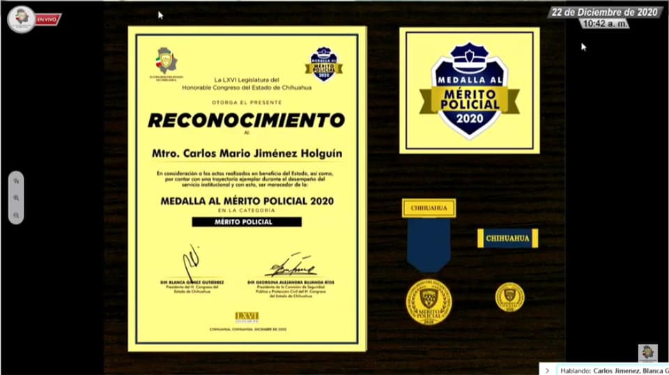 En Sesión Solemne realizada mediante acceso remoto o virtual y encabezada por los representantes de los Tres Poderes del Estado, se hizo entrega del Reconocimiento a las Personas Destacadas de las Instituciones de Seguridad Pública del Estado de Chihuahua, en sus diferentes categorías.