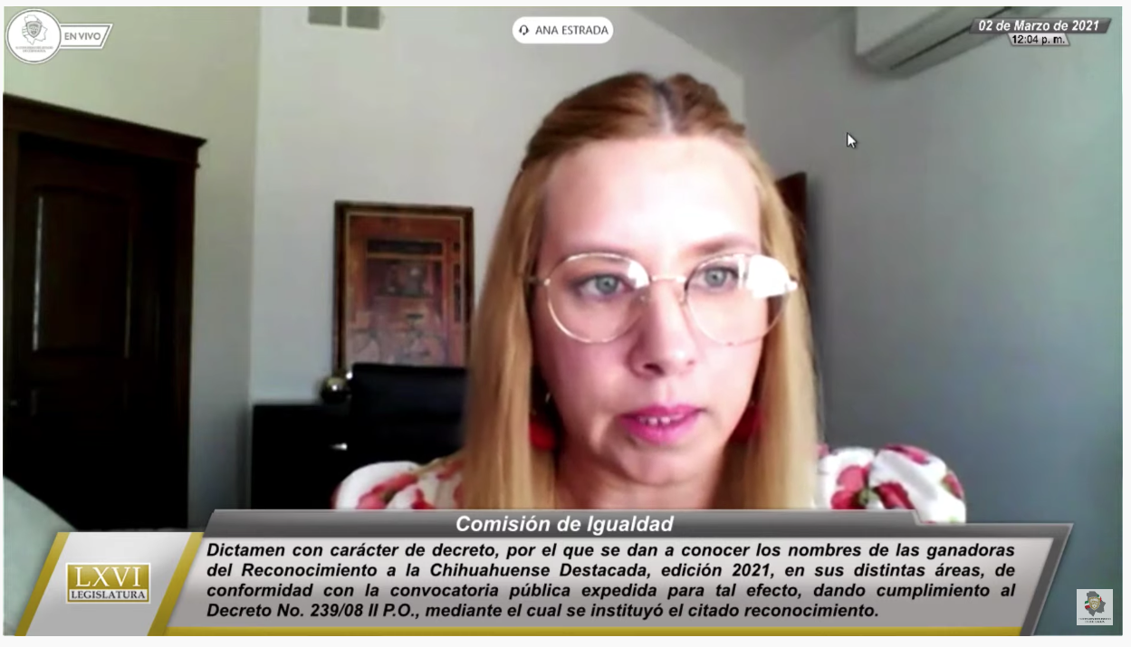 02 de marzo de 2021. Integrantes de la Sexagésima Sexta Legislatura del Congreso de Chihuahua, en Sesión Ordinaria virtual, aprobó el Decreto por el que se dan a conocer los nombres de las ganadoras del reconocimiento a la Chihuahuense Destacada, edición 2021, en sus distintas áreas, de conformidad con la convocatoria pública expedida para tal efecto.