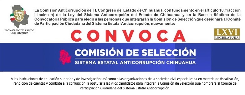 La Comisión Anticorrupción del Congreso del Estado de Chihuahua, te invita a participar en la Convocatoria Pública para elegir a las personas que integrarán la Comisión de Selección que designará al Comité de Participación Ciudadana del Sistema Estatal Anticorrupción.