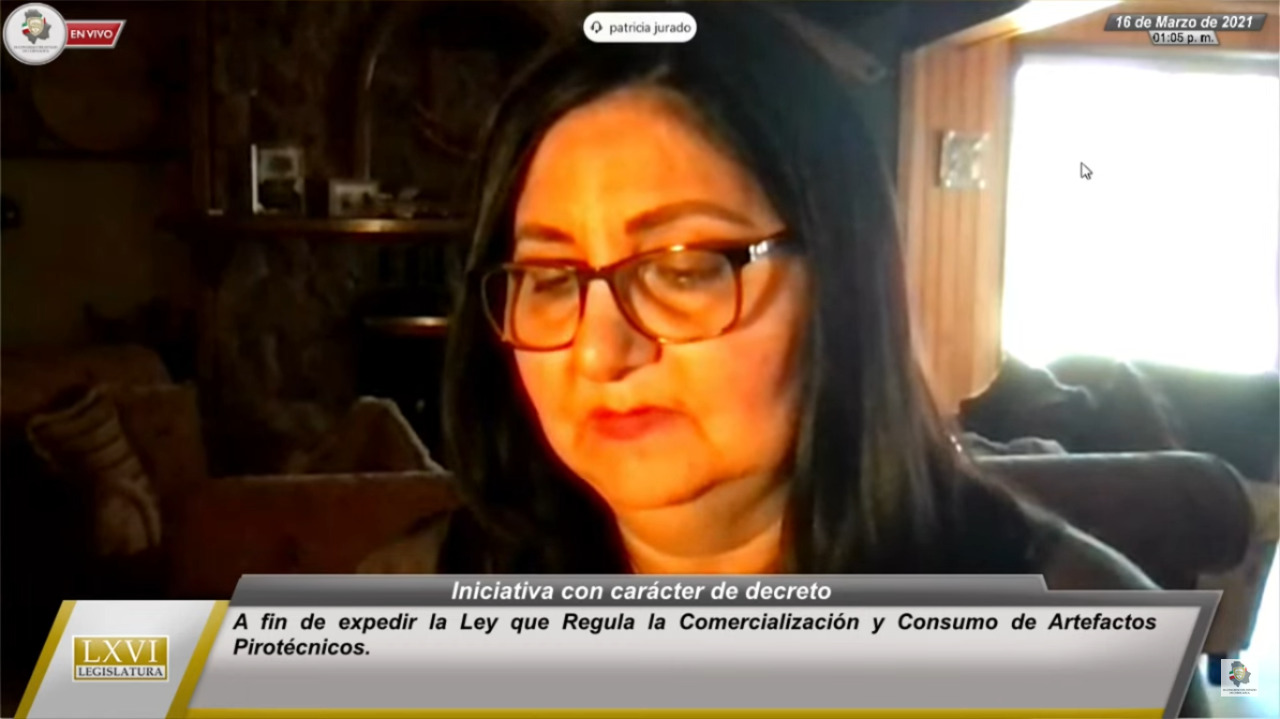 16 de marzo de 2021. La diputada del PAN, Patricia Gloria Jurado Alonso, presentó iniciativa con carácter de decreto, a fin de expedir la Ley que Regula la Comercialización y Consumo de Artefactos Pirotécnicos.