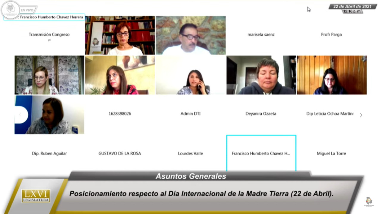 22 de abril de 2021. El diputado Francisco Humberto Chávez Herrera, en asuntos generales de la Sesión Ordinaria de este día, presentó posicionamiento respecto del Día Internacional de la Madre Tierra, que se conmemora cada 22 de marzo a nivel mundial.