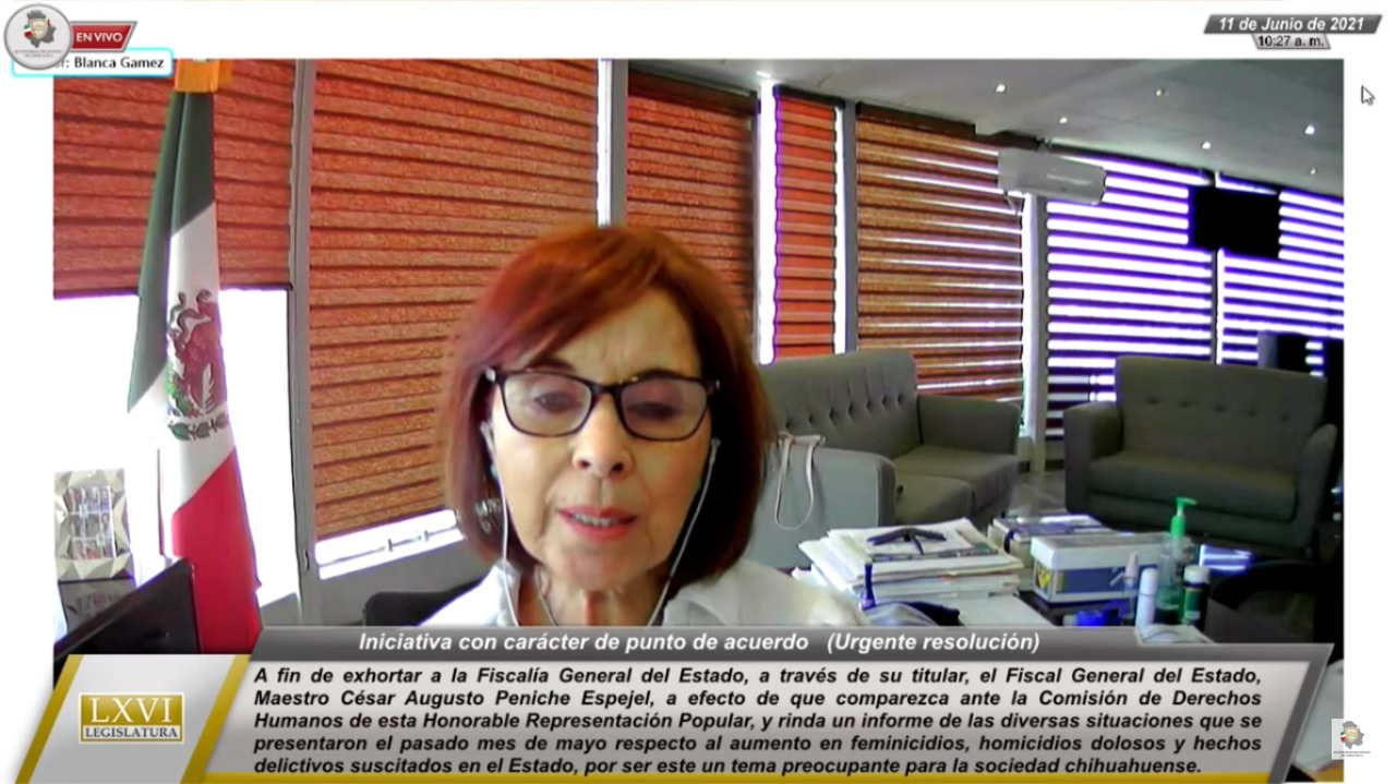 El Congreso del Estado de Chihuahua a través de su presidenta la diputada Blanca Gámez Gutiérrez exhortó al Fiscal General del Estado, César Augusto Peniche Espejel para que comparezca ante la Comisión de Derechos Humanos e informe de las situaciones que se han presentado con respecto al aumento de feminicidios, homicidios dolosos y hechos delictivos en la Entidad.