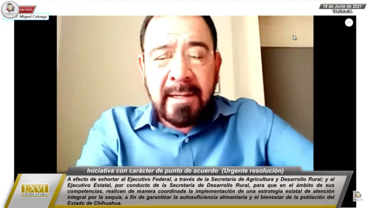 18 de junio de 2021. En Sesión de la Diputación Permanente del Congreso de Chihuahua, fue aprobado de manera urgente el exhorto presentado por el diputado Miguel Ángel Colunga Martínez, integrante del Grupo Parlamentario de MORENA, en el cual se exhortó a la Secretaría de Agricultura y Desarrollo Rural; y al Ejecutivo Estatal, por conducto de la Secretaría de Desarrollo Rural, para que en el ámbito de sus competencias, realicen de manera coordinada una estrategia estatal de atención integral por la sequía, a fin de garantizar la autosuficiencia alimentaria y el bienestar de la población del Estado de Chihuahua.