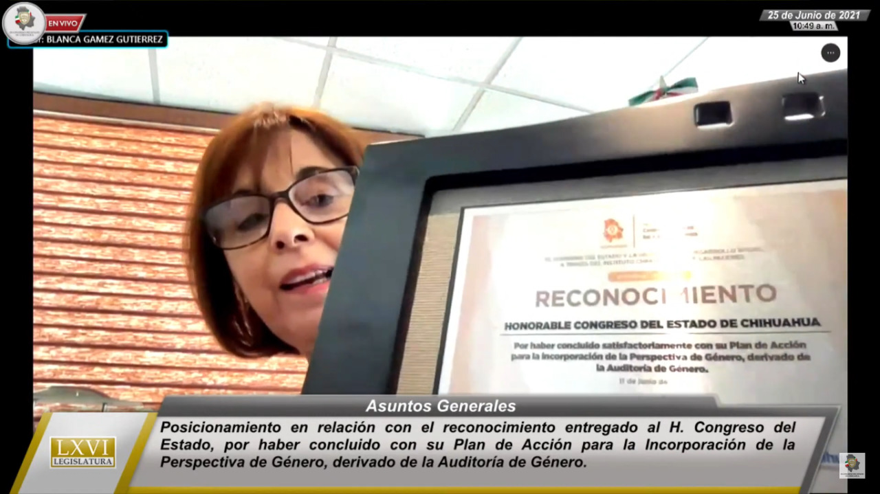 25 de junio de 2021. En Asuntos Generales de la Diputación Permanente, la diputada Blanca Gámez Gutiérrez, presidenta del Poder Legislativo, presentó posicionamiento en relación con el reconocimiento entregado al Congreso del Estado, por haber concluido con su Plan de Acción para la incorporación de la Perspectiva de Género, derivado de la Auditoría de Género.