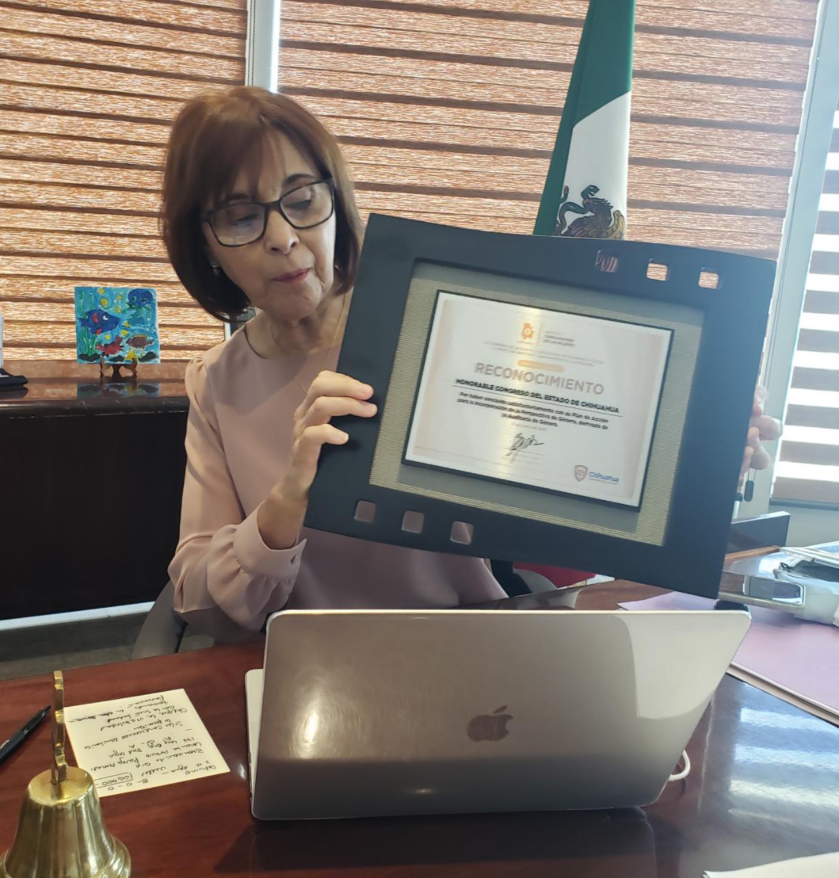 La diputada explicó que fue durante la primera Sesión del Sistema Estatal de Igualdad entre Mujeres y Hombres, que tuvo lugar el 11 de junio, en la que se recibió esta distinción, en un evento encabezado por la presidenta del Inmujeres, Nadine Gasman; el gobernador Javier Corral; y Emma Saldaña Lobera, directora del Instituto Chihuahuense de las Mujeres, organismo encargado de implementar las Auditorías de Género al interior de las instituciones gubernamentales.
