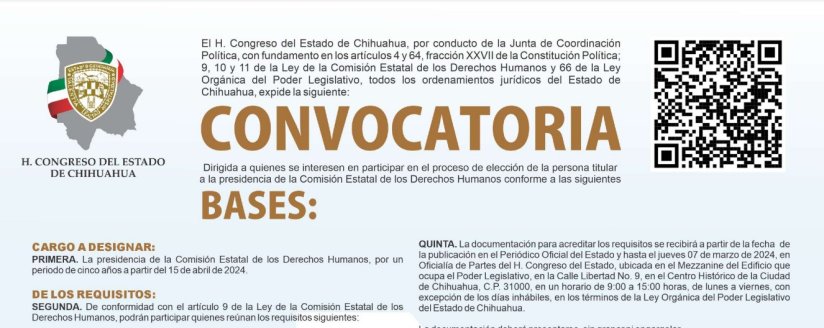 El Congreso del Estado, a través de la Junta de la Coordinación Política (JUCOPO) lanzó este sábado, a través del Periódico Oficial del Estado, la convocatoria para presidir la Comisión Estatal de Derechos Humanos, por un periodo de cinco años a partir del 15 de abril de 2024.