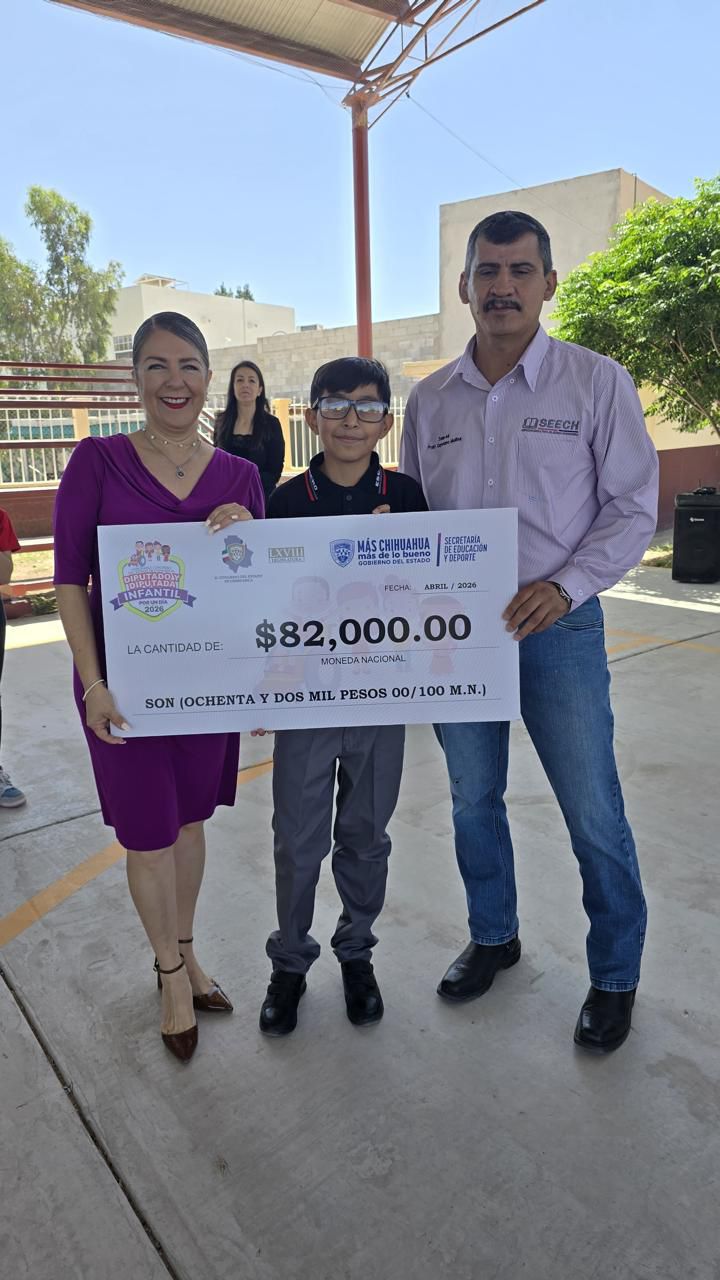 27 de abril de 2026. Cd. Juárez, Chih., En el marco del evento Diputado Infantil 2026, la diputada Rosana Díaz encabezó la entrega de un apoyo económico por 82 mil pesos a la escuela primaria Vicente Guerrero, recurso que será destinado a mejoras en la infraestructura del plantel.