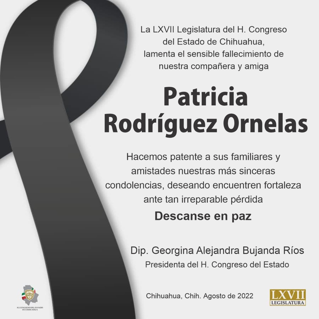 El Congreso del Estado de Chihuahua, lamenta profundamente el fallecimiento de Patricia Rodríguez Ornelas Descargar imagen 05 de agosto de 2022. Descanse en Paz