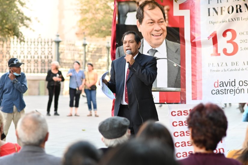 Chihuahua, Chih, 14 octubre 2022. El diputado de morena David Óscar Castrejón Rivas realizó su primer informe de labores legislativas en el corazón de la ciudad de Chihuahua, en la Plaza de Armas, frente al edificio del Congreso del Estado.