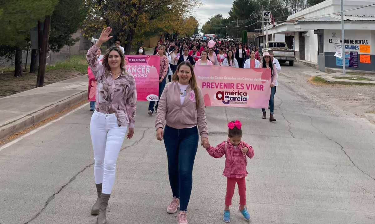 19 de octubre de 2022. Casas Grandes. – Acompañada por decenas de mujeres, niñas y jóvenes de esta ciudad, la diputada local América García, encabezó la marcha para conmemorar el Día Mundial contra el Cáncer de Mama, a fin de sumar esfuerzos para hacer conciencia sobre la importancia de atender este padecimiento, que es una de las principales causas de muerte a nivel mundial, siendo el de mama el que más afecta a las mujeres, por eso es importante detectarlo a tiempo.