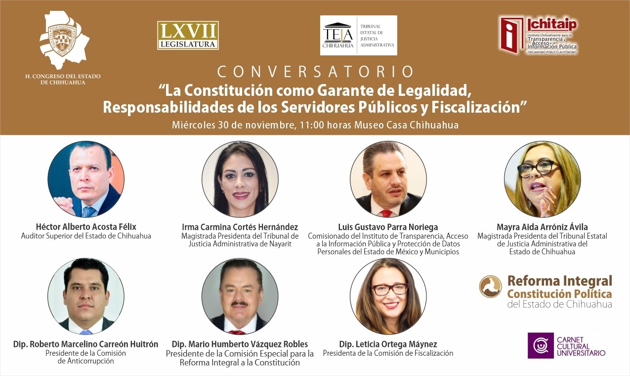 Durante el conversatorio también acompañarán, el Auditor Superior del Estado de Chihuahua, Héctor Alberto Acosta Félix; Mayra Alda Arróniz, Presidenta del Tribunal Estatal de Justicia Administrativa del Estado de Chihuahua; y el diputado presidente de la Comisión Anticorrupción, Roberto Carreón.