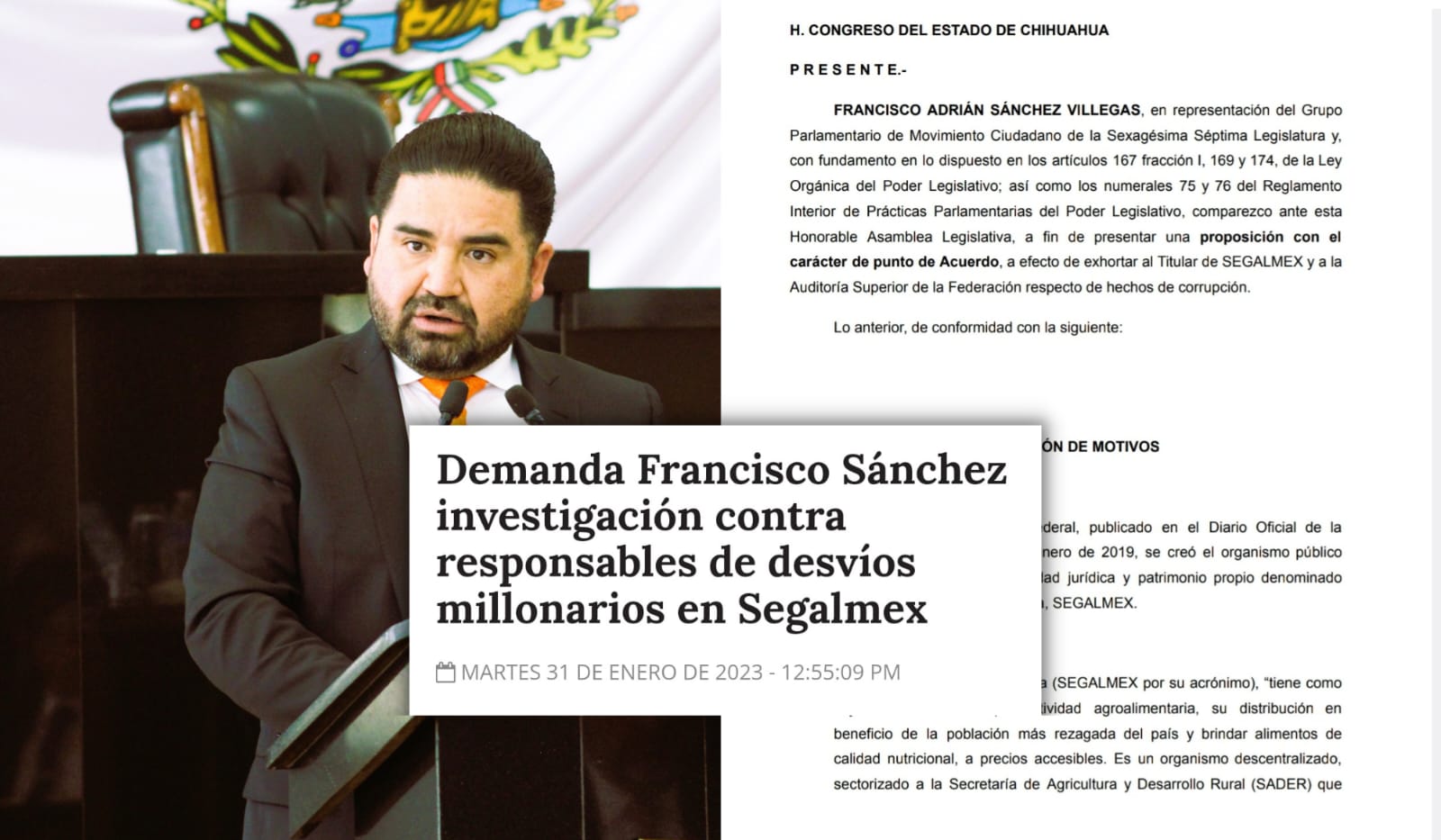 Chihuahua, Chih.- El diputado de Movimiento Ciudadano, Francisco Sánchez Villegas, informó que al fin la Fiscalía General de la República ha tomado cartas en el asunto del desfalco millonario en Segalmex y ha girado órdenes de aprehensión contra 22 funcionarios de este organismo federal.