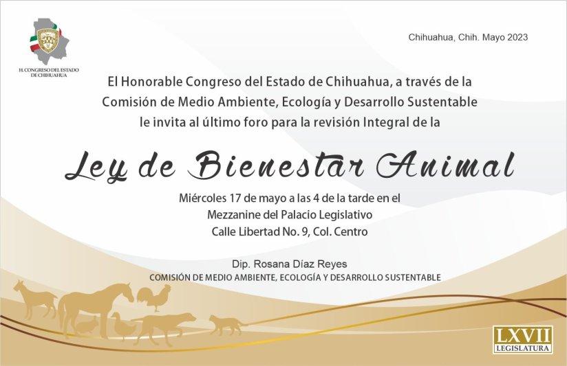 17 de mayo de 2023. Chihuahua, Chih., Este próximo miércoles 17 de Mayo a las 16:00 hrs. en el Mezzanine del Congreso del Estado se llevará a cabo el último foro de análisis de la Ley de Bienestar Animal, por lo que la Diputada Rosana Díaz Presidenta de la Comisión de Medio Ambiente, Ecología y Desarrollo Sustentable hace extensiva la invitación a la sociedad civil, colectivos, especialistas en la materia, estudiantes y servidores públicos para que acudan a participar en las mesas de trabajo que se estarán llevando a cabo este próximo 17 de mayo en el Congreso del Estado.