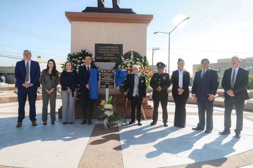 En el evento estuvo presente también el alcalde de Chihuahua, Marco Bonilla, quien encabezó, en la explanada de El Palomar, los honores a la bandera y la develación de una placa en honor a Germán Palma Holguín como Maestro Ilustre edición 2023.