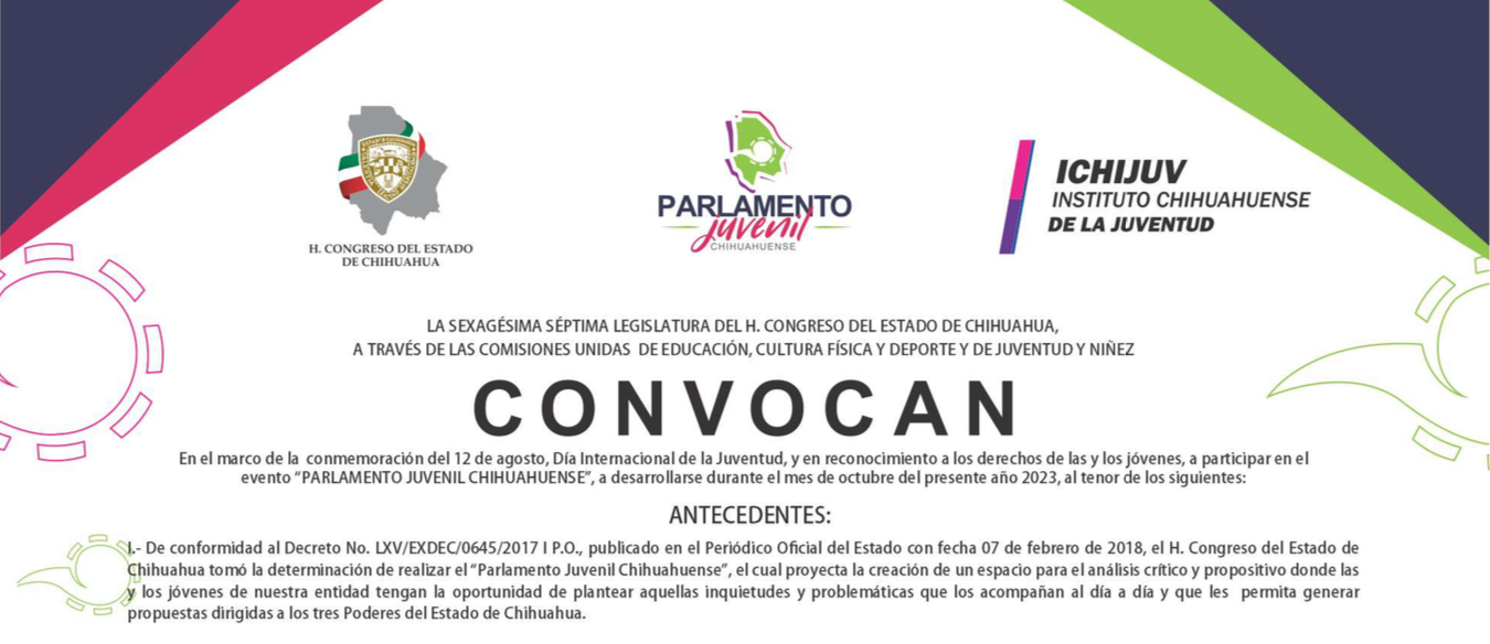 La convocatoria del Parlamento Juvenil Chihuahuense que realiza el Congreso del Estado de Chihuahua, a través de las Comisiones Unidas de Juventud y Niñez y de Educación, Cultura Física y Deporte, así como con el apoyo del Instituto Chihuahuense de la Juventud, recibió un total de 105 solicitudes de participación.